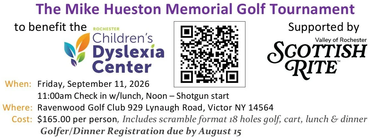 Join the Rochester Children’s Dyslexia Center and Valley of Rochester Scottish Rite for the 5th annual Mike Hueston Memorial Golf Tournament at Ravenwood Golf Club on Friday, September 11th, 2026! Tickets are $165 per person and include 18 holes of golf, cart rental, and two meals. Dinner-only tickets are also available. All tickets are purchasable through mail only. Payments must be made by check, payable to Rochester Children’s Dyslexia Center. Registration must be received by August 15th. All proceeds benefit the Rochester Children’s Dyslexia Center.